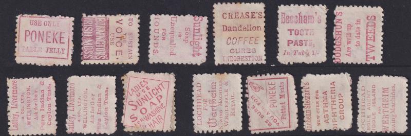 1893 1d SSF p10 red-brown advts, 2nd & 3rd setting x 13, some variable cond. CP DA2j(3). Cat $150+. GU/FU. (Image)