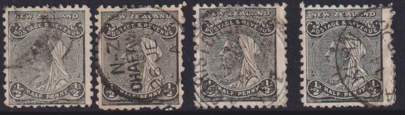 c1895 ½d SSF x 4 diff minor varieties, identified on rear in pencil, along with perfs. (Image)