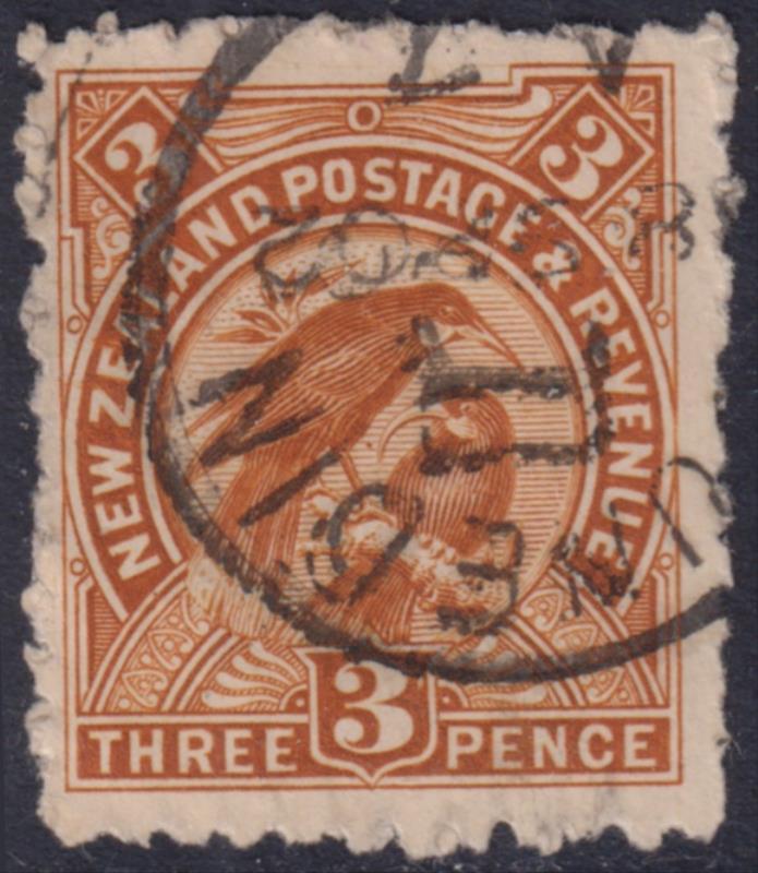 1900 3d Huias, p11, no wmk, double perfs (1 now blind) at base, ex Dunedin 1902. CP E90b(z). Cat $250. (Image)