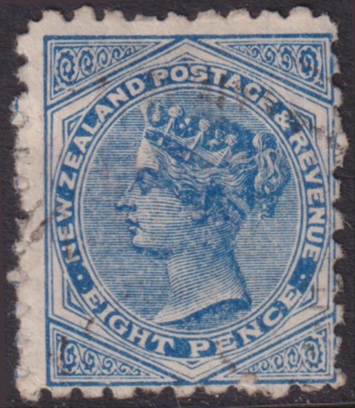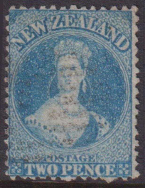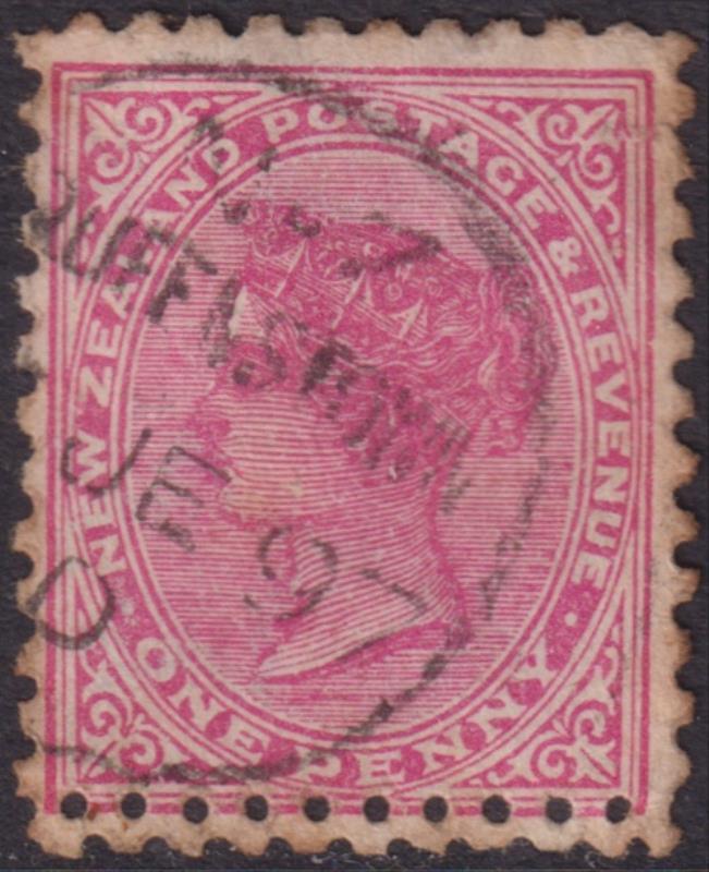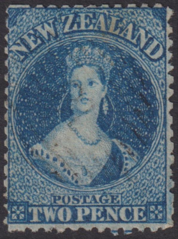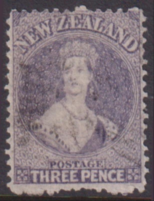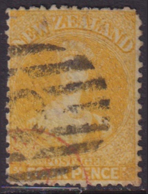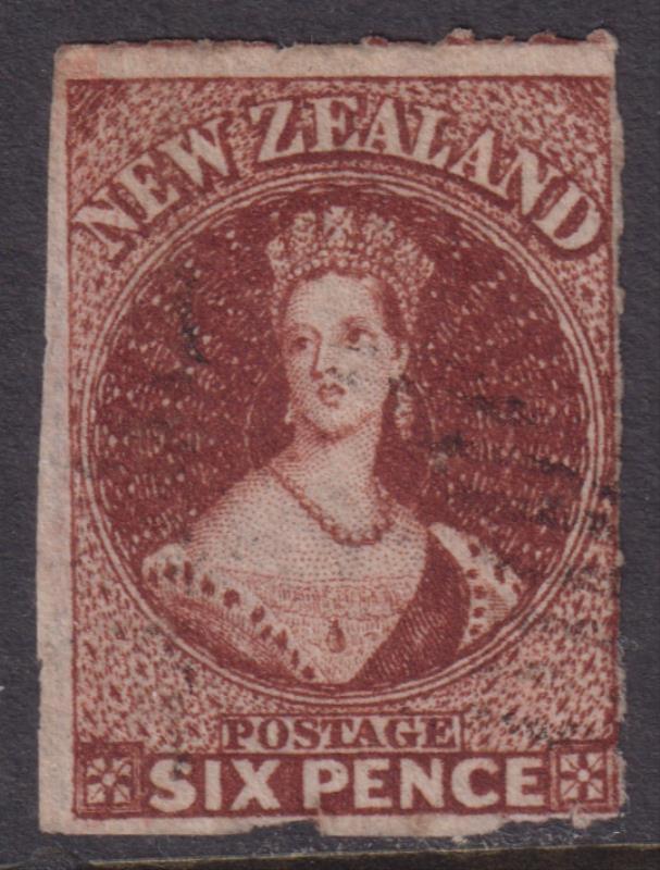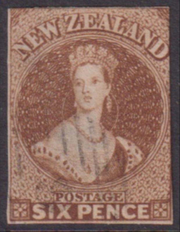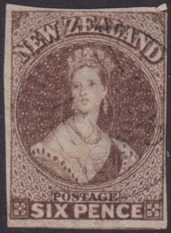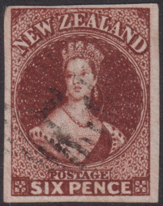 FFQ Chalon 6d red-brown, p13, o/c, barred Otago cancel on face. SG 77. Cat £150. GU. (Image)