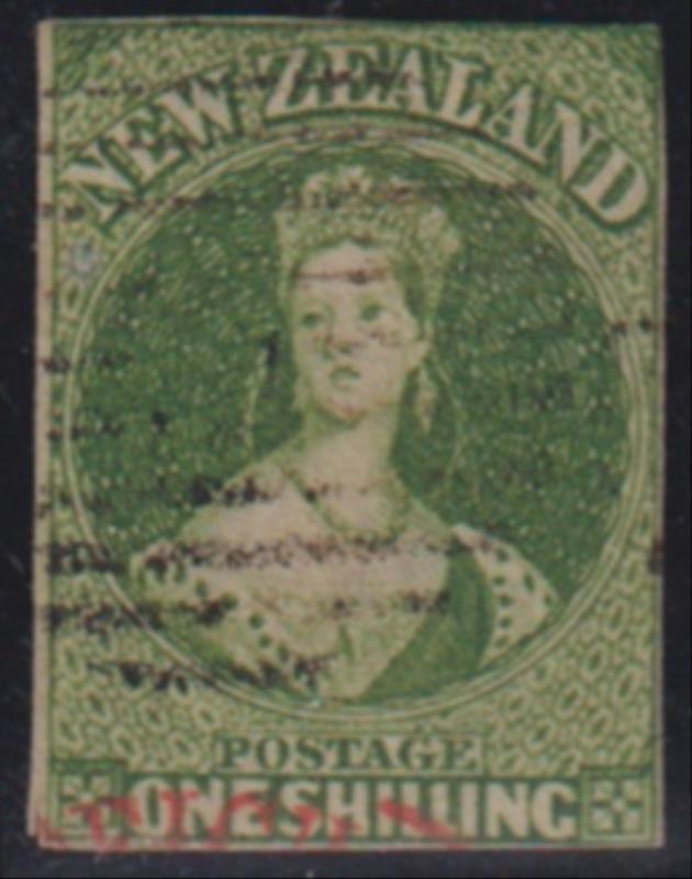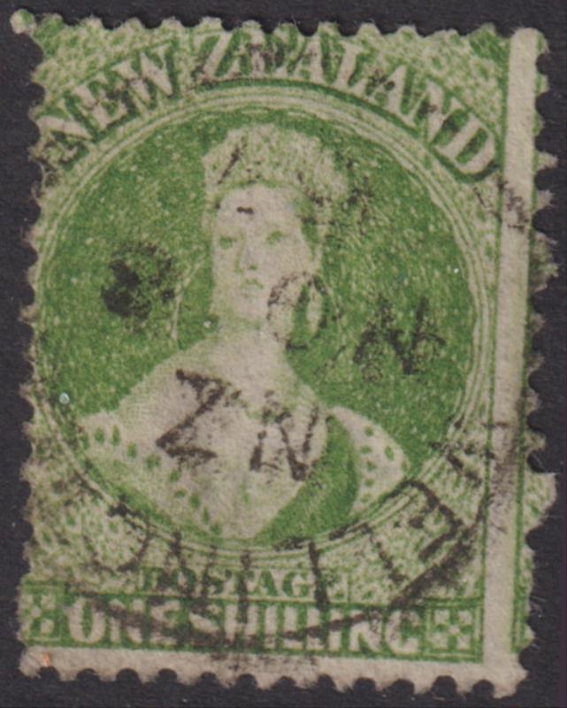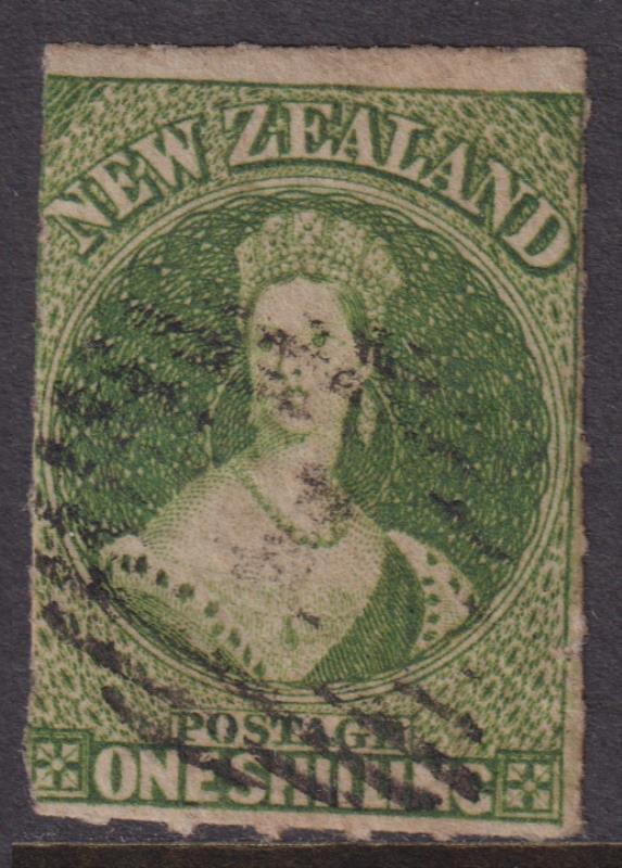 FFQ Chalon 1/- dull emerald-green, imperf 4 margins, huge back thin & closed tear. Fine barred "11" pmk (Port Ahuriri). SG 16. Cat £1900. FU. (Image)