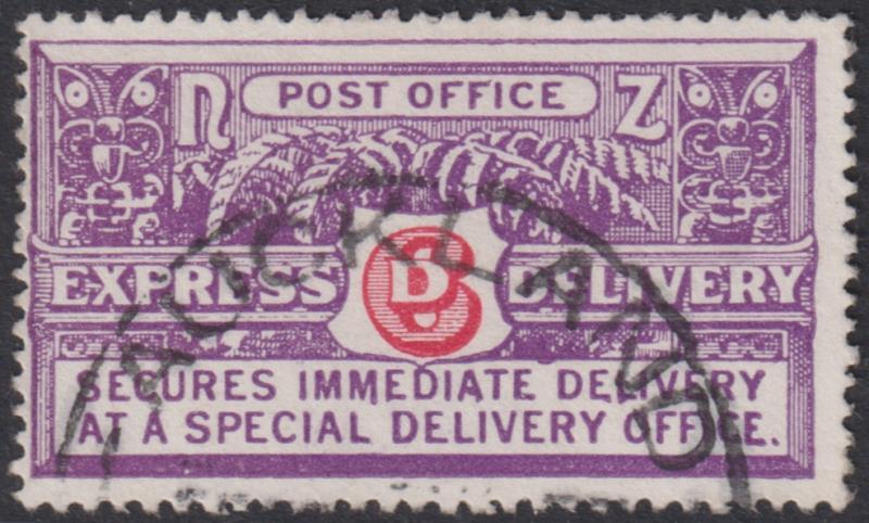 1938 6d Express Delivery, Fernleaves, p14 x 14½ on commercial cover, ex Wellington 25 Jan, to Devonport with same day b/s. Cover also bears airmail label & 4 x 1d Kiwi & some tone spots.