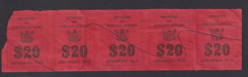 Ministry of Foreign Affairs 1988 $20 Diplomatic Mail horiz strip of 5 from base of sheet, 1st stamp damaged, scarce nonetheless. (Image)