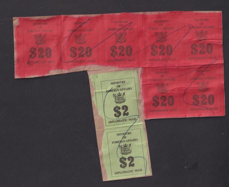 Ministry of Foreign Affairs 1988 $20 Diplomatic Mail incredible block of 9 + $2 x 2, used on piece. [Both $2 & 3 x $20 damaged through poorly rouletted stamps]. (Image)