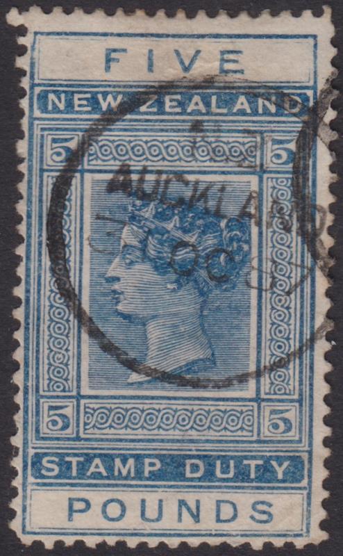 1886 £5 QVLT blue, clear "Auckland 31 OC 87" A class cds (telegraph use), p12½, NZ & star wmk. Light creasing. FU. (Image)