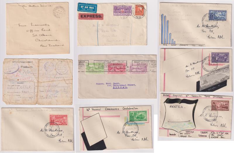 c1900s-50s accum of interesting covers covering wide range topics & eras (no flight covers). Noted 1938 Express Delivery cover; Dunedin Exbn plain FDC (Dunedin Exbn slogan cancel); 1936 Commerce set on individual hand illustrated FDCs (½d blank), all addressed to Mr D Harkness Palmerston North (presumably artist); 1940 Centennial original sets of 12 respectively on 6 & 3 FDCs. A few WWII censored covers & Boer War cover (poor cond). Well over 125 covers. (Image)