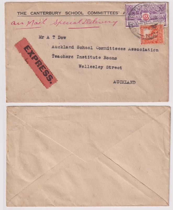 1938 Express Delivery cover from Christchurch to Auckland. 6d Fernleaves & 2d Whare tied by Christchurch 15 JE cds. Inscribed "Air Mail Special Delivery" & Express label. (Image)
