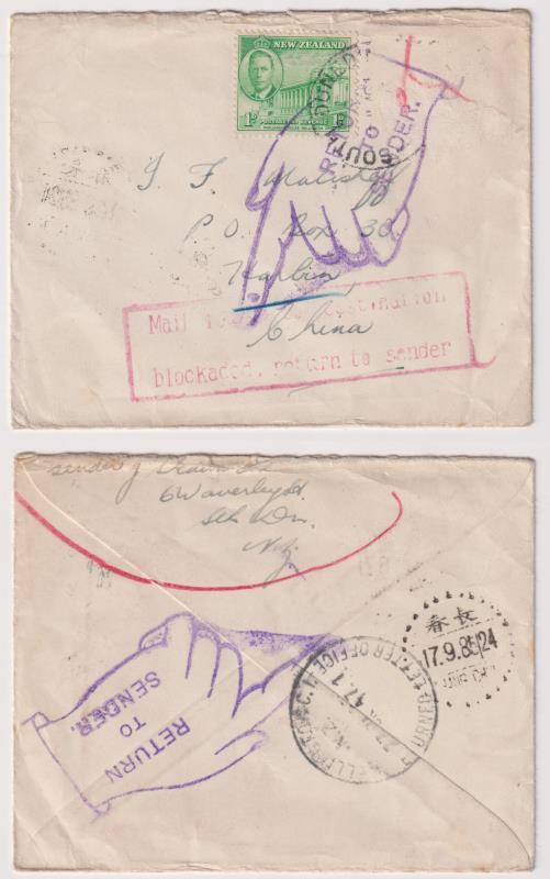 1946 China-Manchuria Harbin blockade cover ex NZ, with 1d Peace (+ a 2nd adhesive subsequently lost in transit) ex South Dunedin (?) JL 46 addressed to Harbin, China. Cover bears boxed 2-line cachet in red “Mail route to destination / blockaded, return to sender” (a quite good impression). Rear bears Chinese bilingual Changchun 17.9.35/24 cogwheel cds, Wellington C.1 / Returned Letter Office 27 JA 47 cds & purple Return to Sender pointing finger cachet (& another on front). Good condition. Rare. Note 1: The Chinese d/s year “35” refers to the 35th year of the Chinese Republic, which commenced in 1911 following the overthrow of the Chinese Empire. Note 2: Russian troops occupied Harbin & other parts of Manchuria after the USSR declared war on Japan on 8 Aug 1945. In April 1946, control of Harbin was passed to the Chinese communist army (the CPLA). Changchun in Northeast China remained under control of the Chinese Nationalist forces & for a time there was no postal communication with Harbin (266 km away). Only 3 covers with this blockade cachet (applied in Shanghai, 2025 km from Harbin) were recorded in a census in the Collectors’ Club journal of March/April 2011. This is likely to be a 4th example & the only one known from NZ. With copy of relevant article & map. (Image)