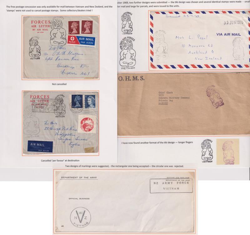 1964-75 Vietnam War New Zealand Forces comprehensive Exbn display on 32 pages (Vermeil award at Perth, 2023). 51 covers (mostly to NZ), various types of postage free franks, ancillary stationery, research re various units etc. Some rare items noted eg: "Vietnam New Zealand Surgical Team Qui Nhon" frank on 1973 cover, "161 Battery" Xmas card, "V Company" unused stationery, & Aust Defence Forces 50c stamp booklet. Also 19 loose additional covers, almost all used to NZ. Fine basis for continuation. Ex RJ Duns. (Image)