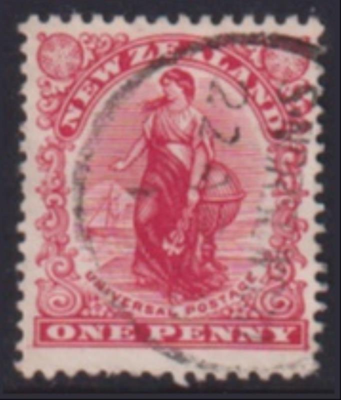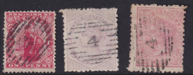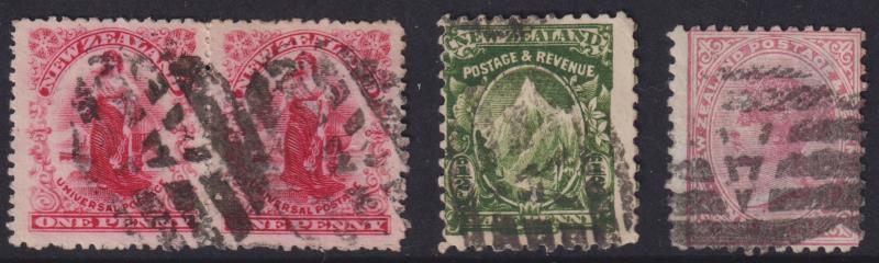 Auckland segmented "A" in 6 bars oval obliterator, 3 fine strikes on c1880s 1d SSF p12 x 11½, c1901 ½d Mt Cook p11, & c1905 1d Universal p14 pair. (Image)