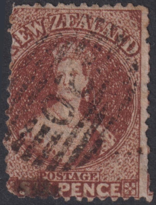 Greymouth (1864- ) good virtually complete "20" in bars obliterator on 6d FFQ red-brown, p12½. (Image)