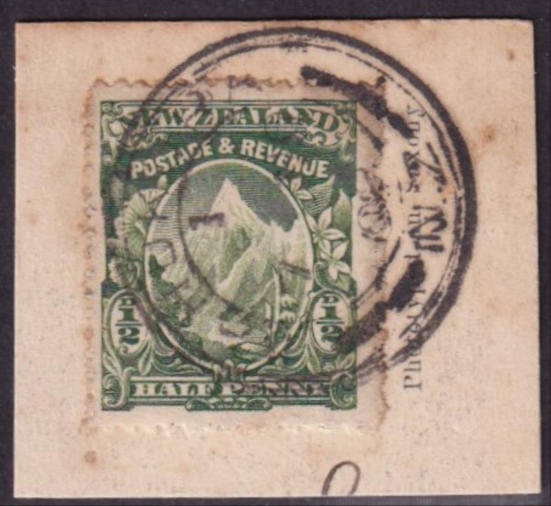 Kahukura (GS 1900-26, to Tikitiki) good complete H-type cds 7 NO 08? on ½d Mt Cook on piece ex PPC. (Image)