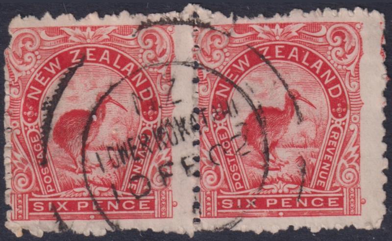 Lower Kokatahi (GM 1877-1967) very fine 10 Feb 1902 "A" class cancel on 6d red Kiwi pair. Wooders 5. (Image)