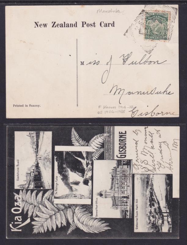 Manutuke (GS 1904-88) complete but only fair strike of F-type d/s 24 AP 08 on ½d Mt Cook on fine greeting PPC. Name hard to make out against dark stamp (some perf tone). This d/s known only 1904-23. (Image)