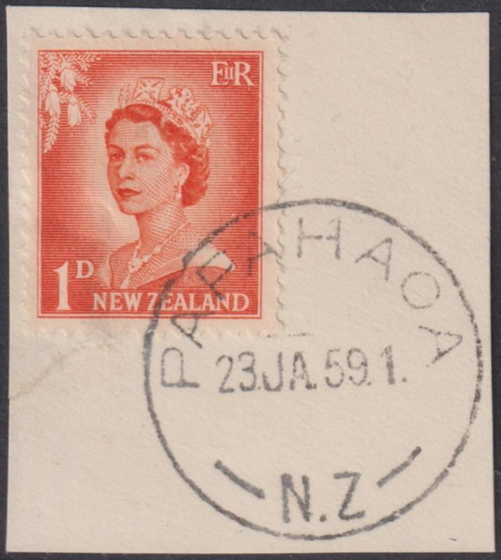 Papahaoa (WP 1919-59, to Sergeant's Hill) fine complete J-type cds 23 JA 59 on 1d QEII on piece. Last day with this name. Gold mining. (Image)