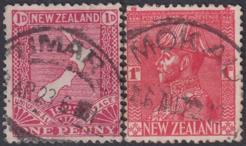 Date stamp errors: 1) Mokau (NU) 26 AU 22 J-type cancel on 1d Field Marshal; 2) Timaru (TU) ? AP 23 J-type cancel on 1d Map. Both FU & dates well before stamps were issued. (Image)