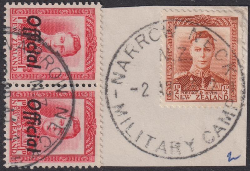 Narrow Neck Military Camp (AK 1940-46) superb J-type cds 2 AU 45 on ½d GVI brown on piece. Also similar but part strike on 1d GVI Officials pair. Wooders 6. (Image)