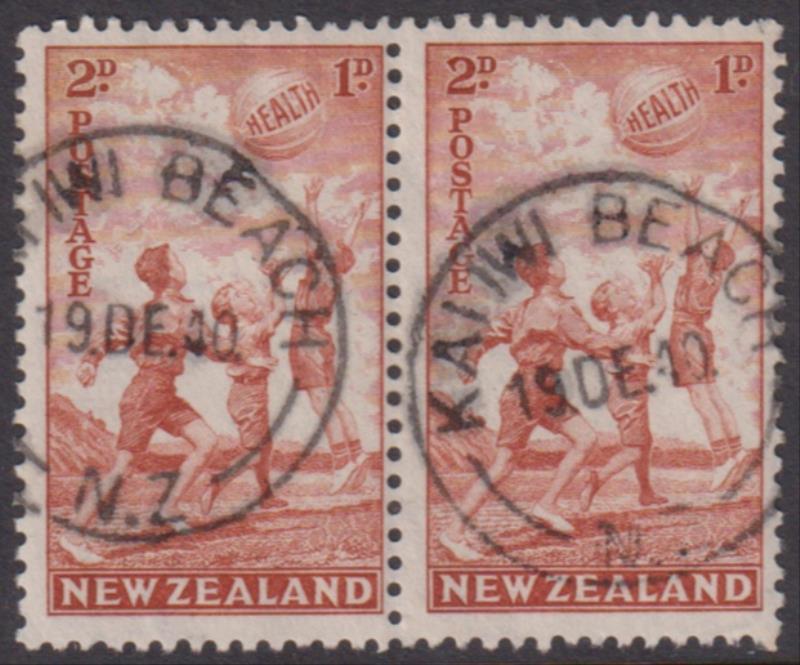 Kai Iwi Beach (WG 1935-48) fine 19 Dec 1940 "J" class cancel on 1940 2d Beachball Health horiz pair. Wooders 6. (Image)