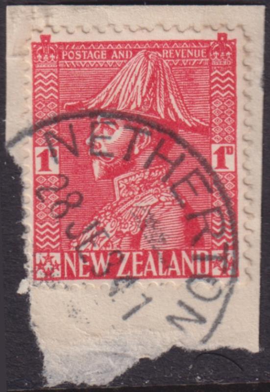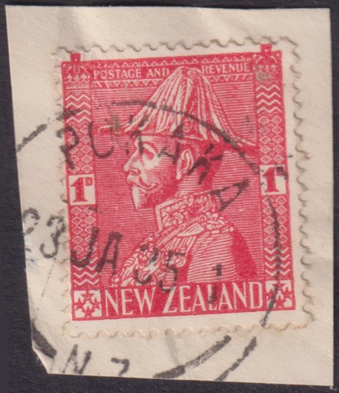 Wharemauku (WN 1929-34) good 8 July 1933 "J" class cancel on 1d Field Marshal on piece. Wooders 7. (Image)