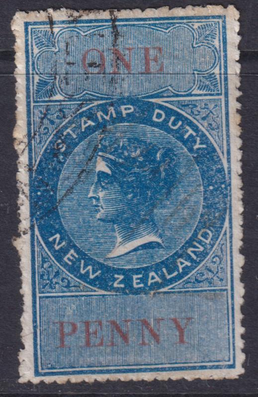 1867 1d QVLT die I, blue & red, NZ wmk invtd & reversed. Experimental H-roulette separation on all sides. Surprisingly w/c. H/s cancel. Fine example. Rare. Kiwi R259e. Cat $750. (Image)