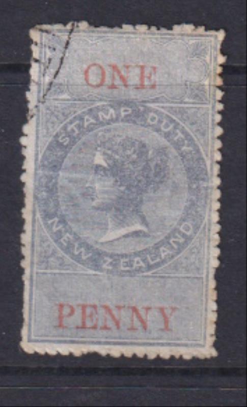 1867 1d QVLT grey & red, die I, NZ wmk invtd & reversed. H-roulette on all sides, corner h/s cancel, toned 'perf'. Rare experimental separation. Nice example. Kiwi R259a. Cat $650. (Image)