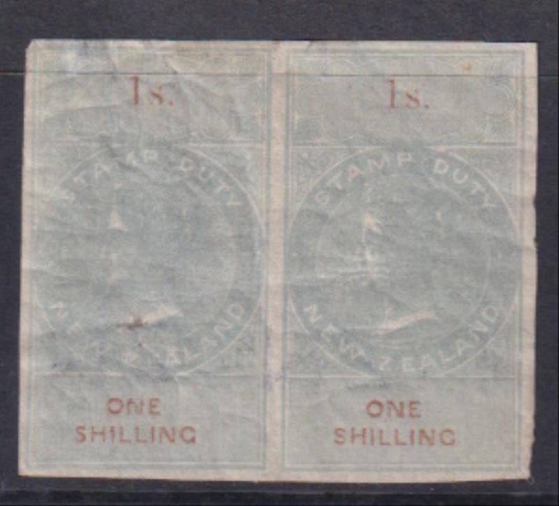 1867 1/- QVLT pale grey & red horiz pair, die I, value at base in 2 lines, NZ wmk invtd & reversed, imperf, 4 margins. Quite unclear impression. With almost all original gum. Back thin on 1 corner. Rare mint multiple. Kiwi R189. (Image)