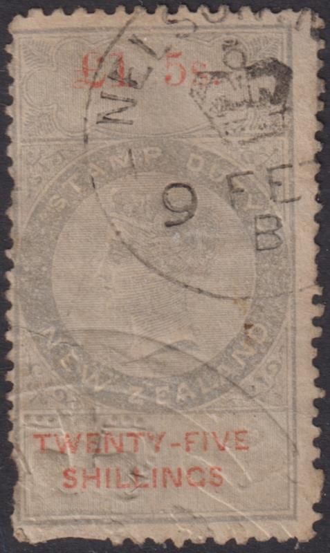 1867 25/- QVLT pale grey & red, with neat Nelson cds (9 FE 7_) & embossed. Minor buckles. Kiwi R239. Cat $150. (Image)