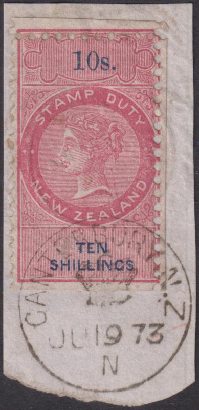 1873 10/- QVLT rose & blue, good margins, p10 sides, imperf top & bottom. On piece & canc "Canterbury N.Z. JU 19 73". Nice example. Kiwi cat $15+. (Image)