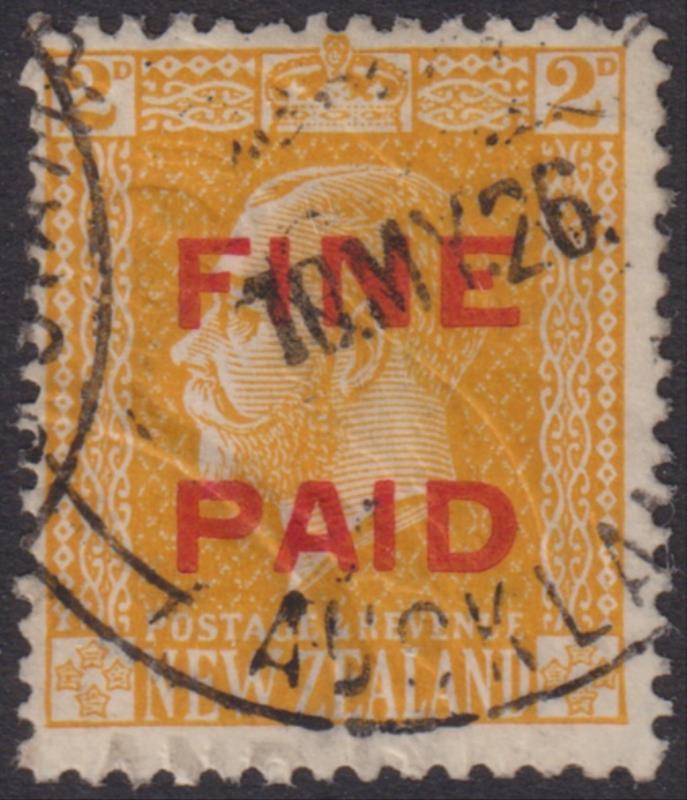 1922-37 "FINE PAID" ovpt (red) on 2d GV yellow, p14 x 15, DLR. Unpunched used (clear 10 MY 26 steel cds cancel). Kiwi R60a. Cat $30. (Image)