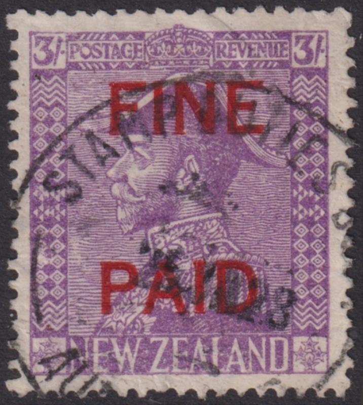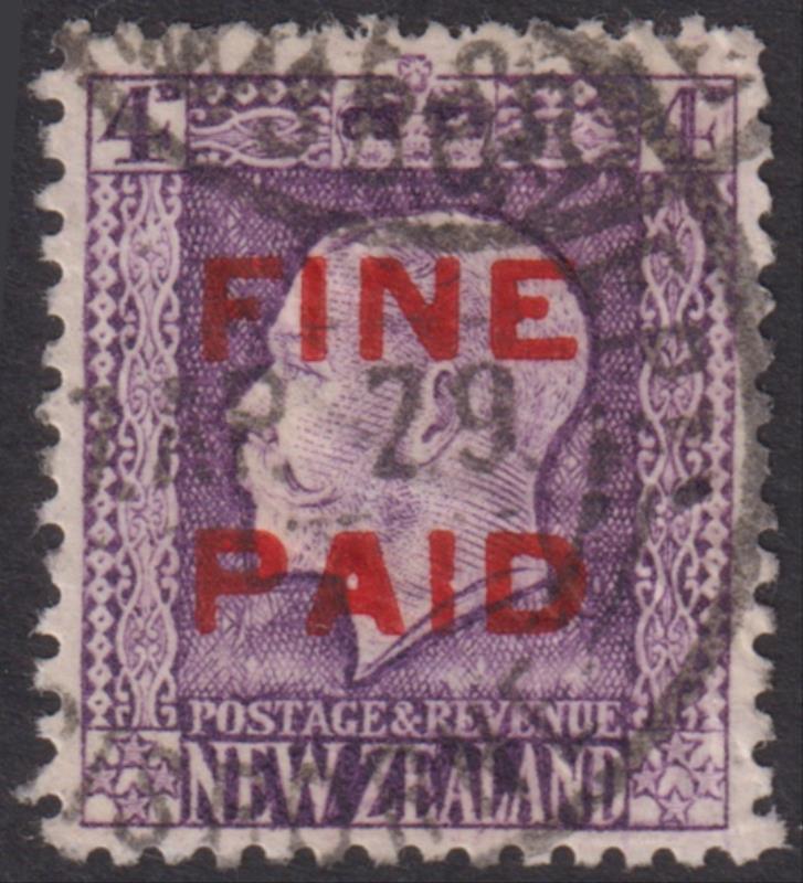 1922-37 "FINE PAID" ovpt (red) on 4d GV bright violet, p14 x 13¼. Clearly worn plate. Unpunched used. Clear 17 AP 29 steel cds cancel. Kiwi R62a. Cat $30. (Image)