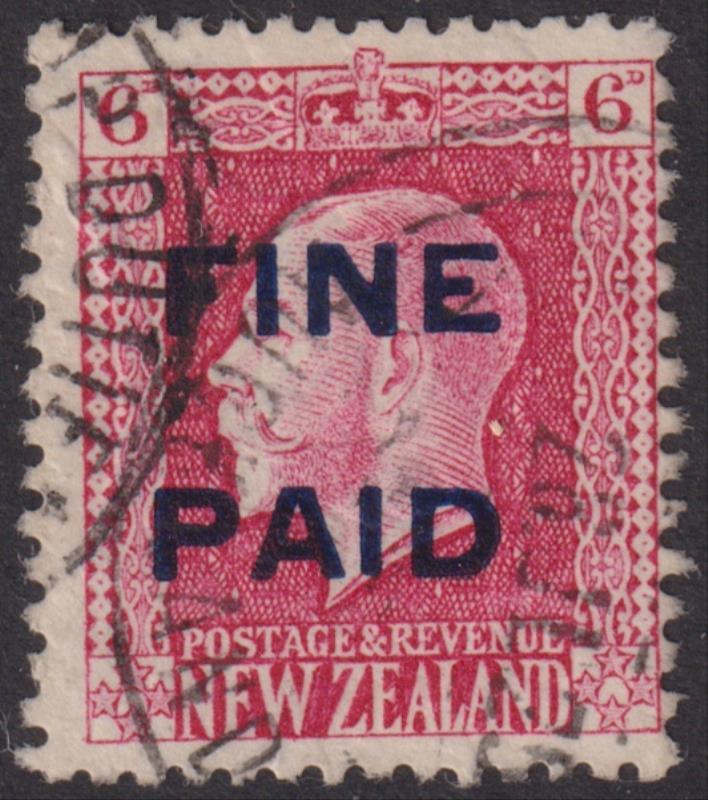 1922-37 "FINE PAID" ovpt (blue-black) on 6d GV carmine, p14 x 13¼. Unpunched used, fine. Kiwi R63a. Cat $60. (Image)
