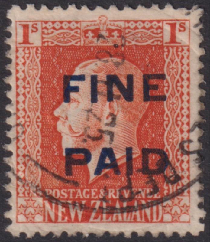 1922-37 "FINE PAID" ovpt (blue-black) on 1/- GV orange-vermilion, p14 x 14¼. Unpunched used, fine. Kiwi R66. Cat $50. (Image)
