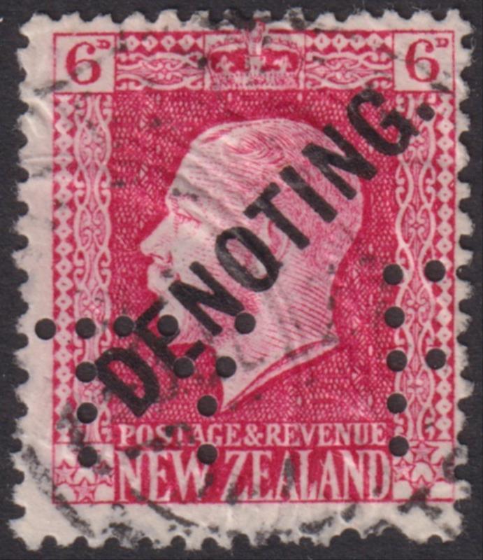 1924-37 "DENOTING" ovpt on 6d GV carmine, p14 x 13¼. Perfin punched used. Kiwi R47c. Cat $125. (Image)