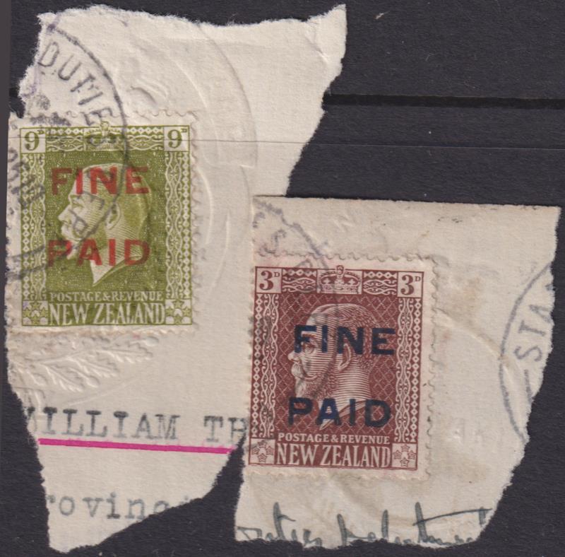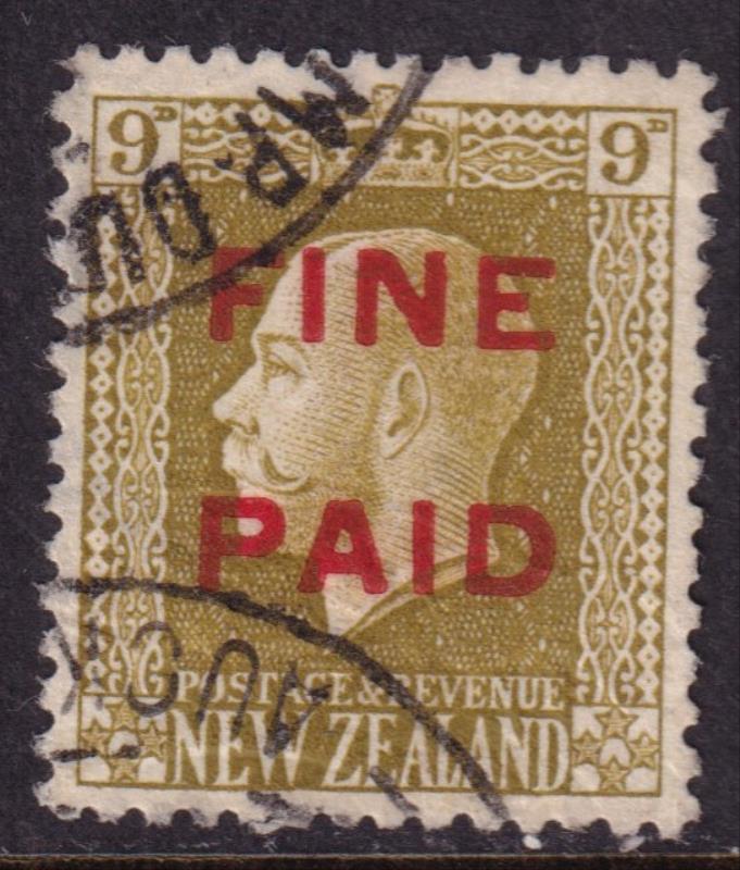 1922-37 9d GV yellow-olive with "FINE PAID" ovpt (red), p14 x 13¼, unlisted in Kiwi Catalogue. The basic yellow-olive p14 x 13¼ variant (without ovpt) was first issued in Dec 1925. To be listed as Kiwi R65c ($70). Fine used (unpunched). (Image)