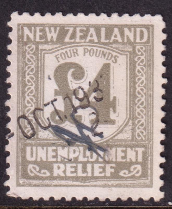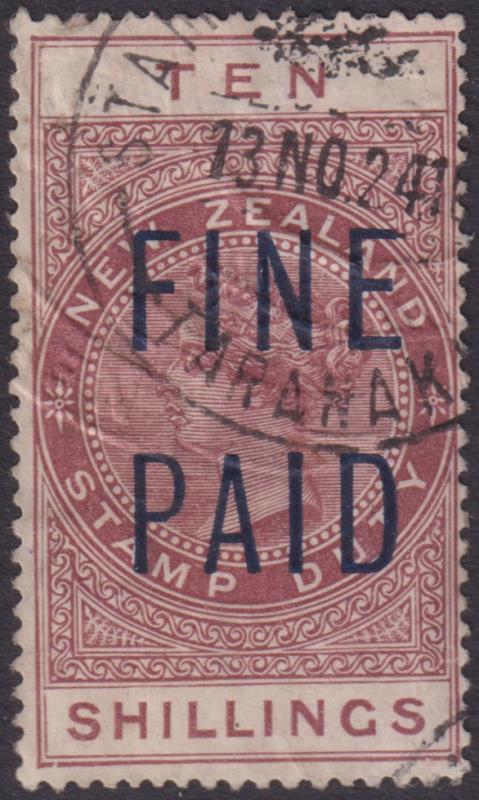 1924 10/- QVLT maroon FINE PAID, embossed but unpunched with clear 13 Nov cds. Kiwi R77. Cat $250. (Image)