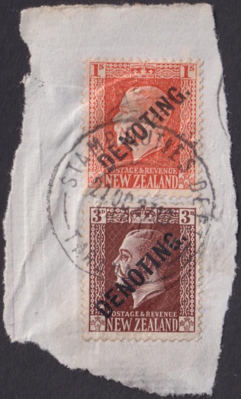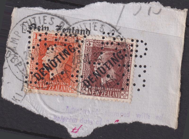 1927 3d GV, p14 x 15 & 1/- GV p14 x 14½, both DENOTING & embossed but unpunched, on piece dated 21 Oct. Kiwi R47-R47a & R48c. Cat $280. (Image)