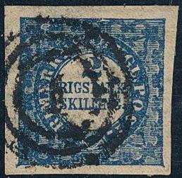 Denmark, Facit 1 or Scott 1 or AFA 2 used, 1851 2 Rigsbank-skilling blue. Nice copy with good margins. F 11000 (Image1)