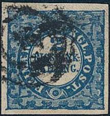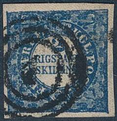 Denmark, Facit 1 or Scott 1 or AFA 2 used, 1851 2 Rigsbank-skilling blue. Large margins, but with an unclear cancel. F 11000 (Image1)