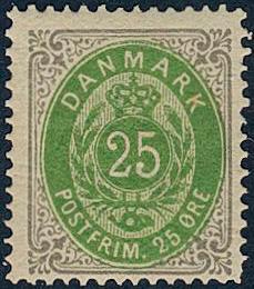 Denmark, Facit 35 or Scott 32 or AFA 29 **, 1875 Øre values 25 øre green/grey. F 1700 (Image1)