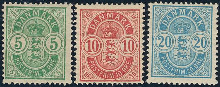 Denmark, Facit 53–55 **, 1884 Coat-of-Arms large figures 5, 10 and 20 øre perf 14 × 13½. F 2600 (Image1)