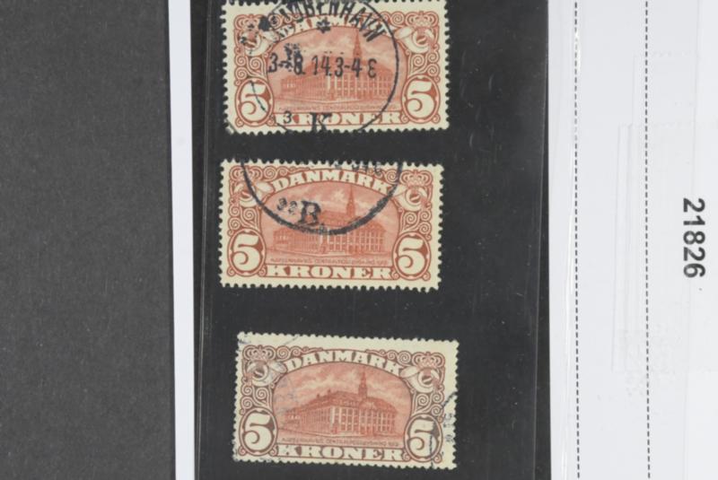 Denmark, Used lot 1912–1915. 120vm, 120v1 and 121v2. Copenhagen G.P.O. Three stamps with varities. Vm crown Inverted, vm crown vertical line in N is missing and vm crosses KJÖBFENHAVN. 10500 (Image1)