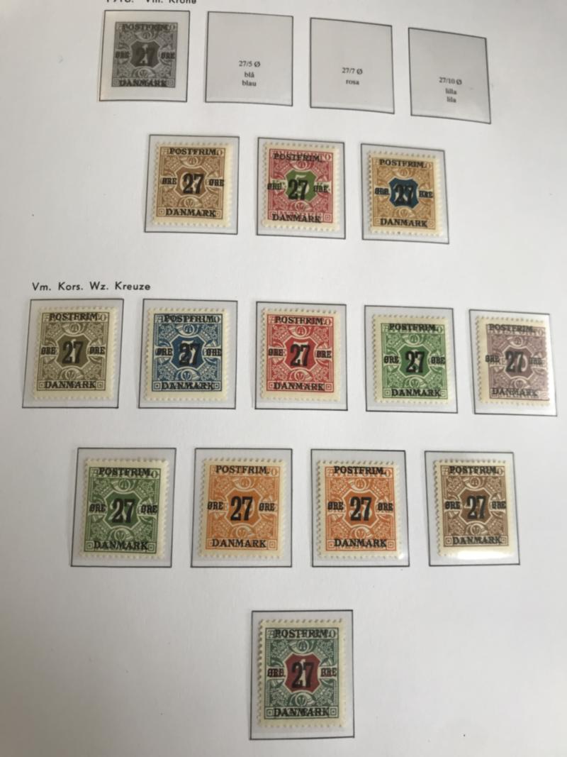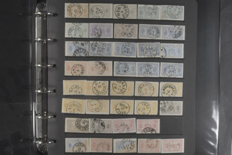 Denmark, Used collection/accumulation 1872–1919 in visir album. Officials. Largs officials (both perf 14 and perf 13) on ten visir leaves. Not explored. Options for shades, plate flaws, good cancellations, etc. Addtionally a stock material of small officials on four visir leaves with options for cancellations watermarks, shades, etc. Also not explored. Please see a selection of scans at www.philea.se. Mostly good quality (>500) (Image1)
