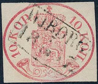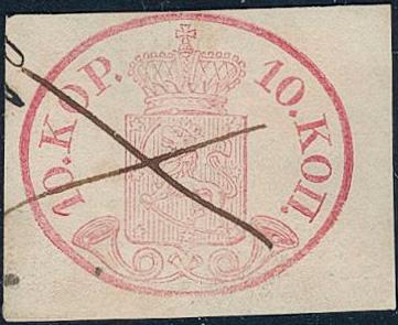 Finland, Facit 2 or Scott 2 used, 1856 Oval stamps 10 k carmine. Cancelled by hand. A bit near cut. A bit faded. F 7500 (Image1)