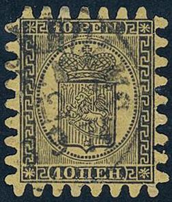 Finland, Facit 7 or Scott 8 used, 1866 Coat-of-Arms Finnish values 10 p black on yellow paper. F 2500 (Image1)