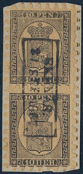 Finland, Facit 10 or Scott 11 used, 1867 Coat-of-Arms Finnish values 1 Mk brown in vertical pair. On paper cancelled EKENÄS 1867. Cert by Raybaudi 1979. 1 more image is available at www.philea.se. (Image1)
