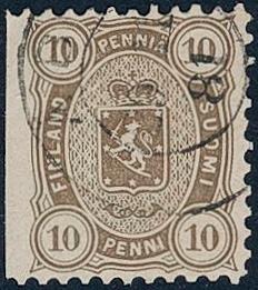 Finland, Facit 15Sv7 or Scott 20 or Norma 20S used, 1882 Coat of Arms m/75, Senate printing 10 p yellowish olive-brown, one side imperf. F 4000 (Image1)