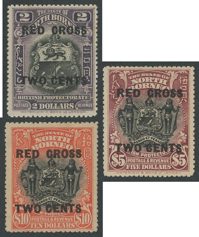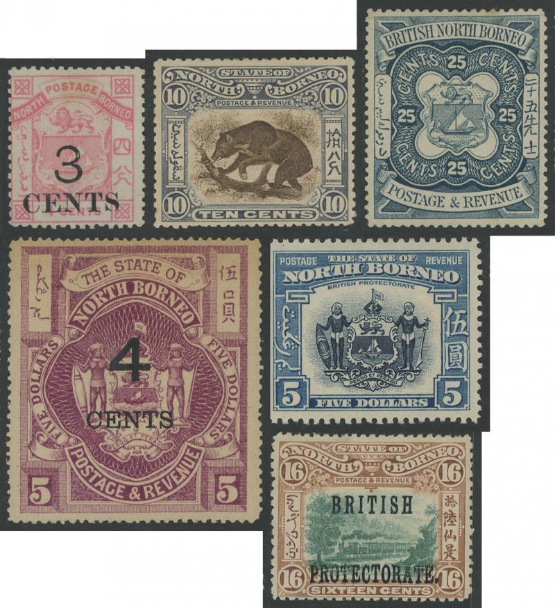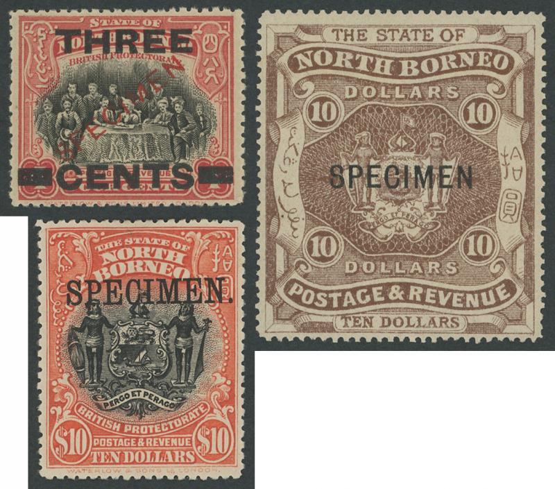 SPECIMEN STAMPS: Selection of 'SPECIMEN' overprints including 1894 Arms 'State of North Borneo' set SG 81s-86s, 1995 '4/CENTS' Surcharges set SG 87s-91s, 1897-1902 Pictorials range including re-inscribed 18c, 1901-05 'British Protectorate' Overprints set (ex 1c & 8c), 1909-23 Pictorials & Surcharges set, 1911 Arms set, etc, condition a little variable a few with minor blemishes, gum tropicalisation and/or small hinge remainders but most are fine to very fine, Cat £1600+.