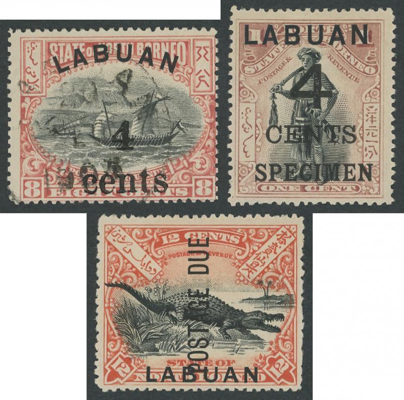 LABUAN: 1890s-1900s collection from 1894 'LABUAN' Superscriptions on North Borneo Pictorials set plus extra shades of 8c, 18c & 24c * and a range of used, then 1895 Surcharges on $1 Arms set *, used (the 20c with Singapore cds) & 'SPECIMEN' overprints, 1896 Overprints on Arms set * & 'SPECIMEN' overprints, 1896 Jubilee set *, used & 'SPECIMEN' overprints, 1897-1901 Pictorials set * (5c used) plus 12c 'LABUAN' at foot * & used x2, 1899 '4/CENTS' Surcharges set * & 'SPECIMEN' overprints (ex 12c) plus unissued 1c, 2c & 3c, 1900-02 Pictorials set *, 1902-03 Crown set * & 'SPECIMEN' overprints, 1904 '4/cents' Local Surcharges set * & used (ex 12c), also 1901 Postage Due overprints set * plus a few duplicates throughout, condition a little variable some with minor blemishes, gum tropicalisation and/or hinge remainders, Cat £4500+.