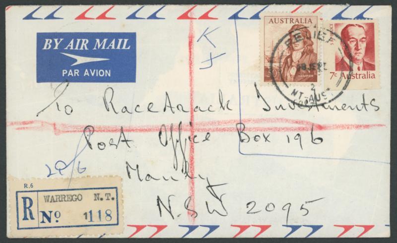 Handy selection with commercial covers from 'FINKE' (1945; stained), 'ALYANGULA', 'NIGHTCLIFF', 'DALY WATERS' (1936 with manuscript "Victoria R Downs" R label) and 'RELIEF/18JE72/ 2 /NT-AUST' with typed "Warrego NT" on blank R label (rare), also 'TIMBER CREEK' (fair only on 1935 flight cover with red/white 'Victoria River (N.T.)' R label). WWII military covers x25 with various FPO & similar datestamps all noted as used in the Territory, loose R labels including red/white 'EMUNGALAN/S AUS', 'PARAP NT' & 'PARAP/NT', condition variable.