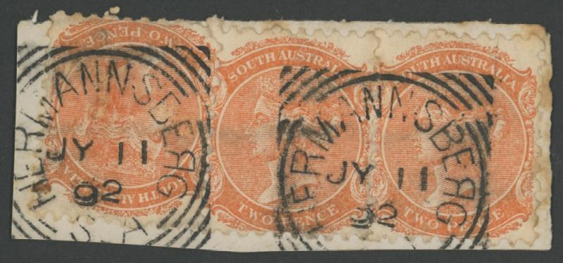 Hermannsburg (1): squared-circle 'HERMANNSBERG/JY11/92/S A' (error for '...BURG'; and the Second 'R' Reversed) two largely very fine strikes on South Australia QV De La Rue 2d orange x3 on small piece. Rated RRR. PO 1.9.1891; RO -.1.1910; closed 1.9.1917. Ex John Boykett. (Image1)